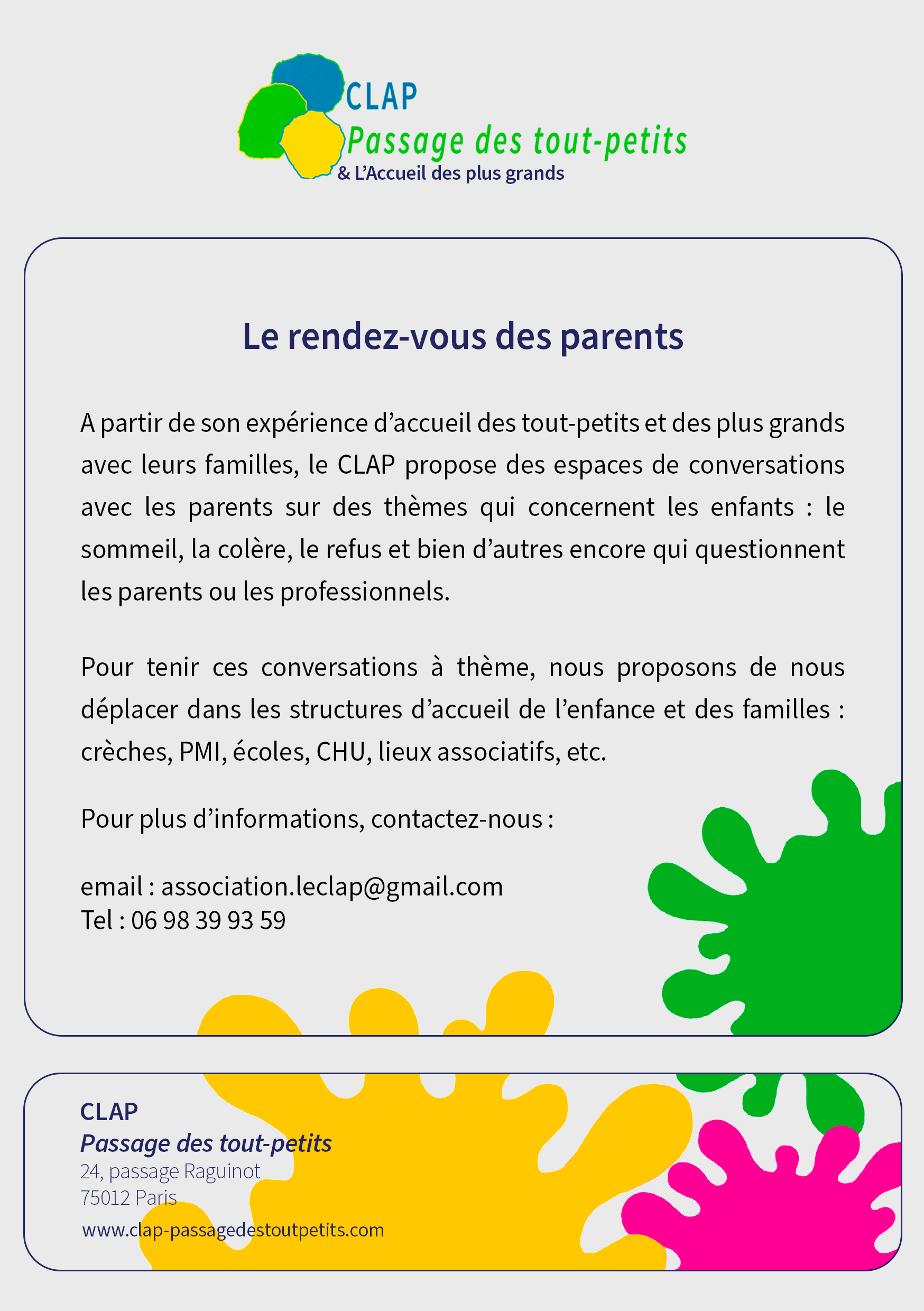 À partir de son expérience d’accueil des tout-petits et des plus grands avec leurs familles, le CLAP propose des espaces de conversations avec les parents sur des thèmes qui concernent les enfants : le sommeil, la colère, le refus et bien d’autres encore qui questionnent les parents ou les professionnels.